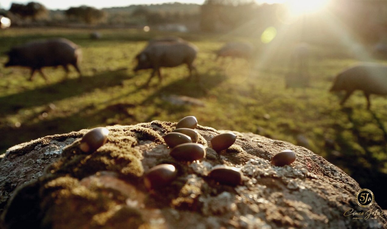 Vor allem findet es in seinem Habitat im Herbst Eicheln als Futter und setzt so – auch das eine Besonderheit – besonders viel Fett in den Muskelpartien an. Darum erhält sein Fleisch eine unvergleichliche Marmorierung und ein feines Nussaroma. Cinco Jotas verarbeitet von den 100% rassereinen Schweinen vor allem die Vorder- und Hinterläufe zu aromatischen «Iberico Bellota» Schinken. Aus den anderen Fleischstücken werden zum Beispiel die etwas weniger bekannten getrockneten Lomo oder Chorizo hergestellt. Exquisite Produkte aus einem besonderen Terroir.